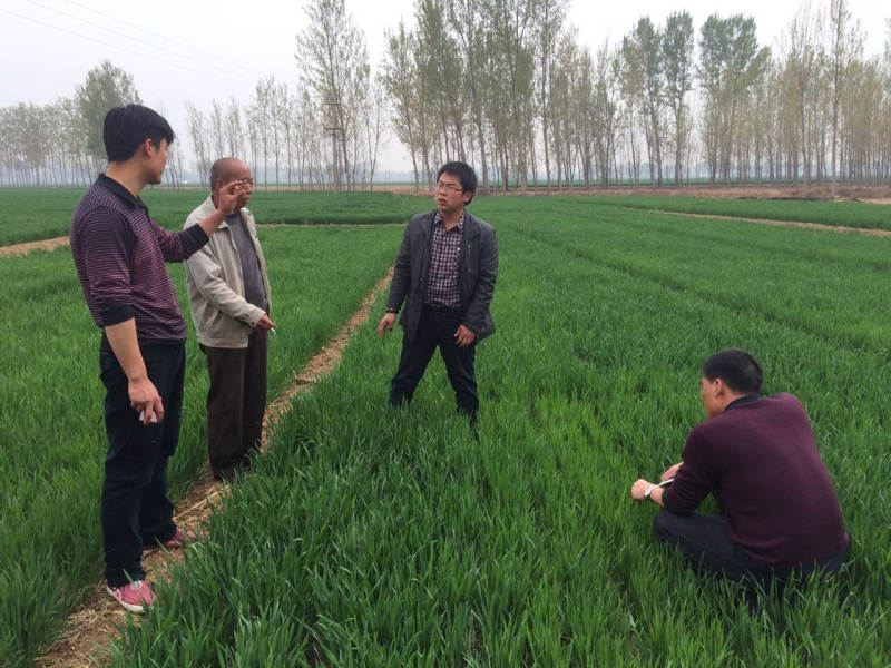 邓超(右二)在小麦地指导农民用肥