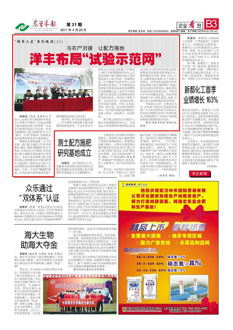据介绍,作为活动发起者之一,洋丰集团为推动测土配方施肥和新肥料研发,与去年牵手中国农业大学成功组建了中国农大·金沙9001以诚为本新型肥料研发中心,打造全国测土配方施肥试验示范网络是该中心成立后的一项重要内容。洋丰集团产品研发中心主任