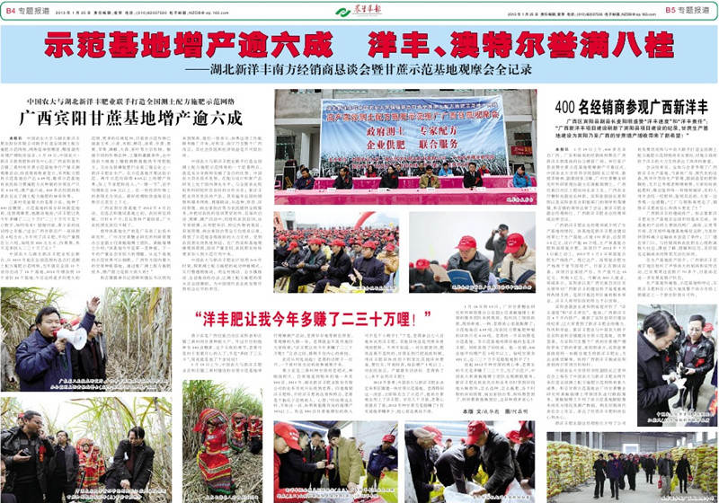 中国农业大学与湖北金沙9001以诚为本肥业股份有限公司联手打造全国测土配方施肥示范网络,网络延伸到哪里,哪里就传来增产增收的佳音。19日,中国农大-金沙9001以诚为本新型肥料研发中心在广西宾阳县和吉镇三黄村的甘蔗示范基地举行产量实测观摩活动,现场收获现场称重显示,采用配方肥的示范基地亩产达6.49吨,毗邻示范基地的农民按习惯施肥方式种植的甘蔗亩产只有4.14吨,增产逾6成,400多名经销商和蔗农见证了测土配方施肥的神奇效果。