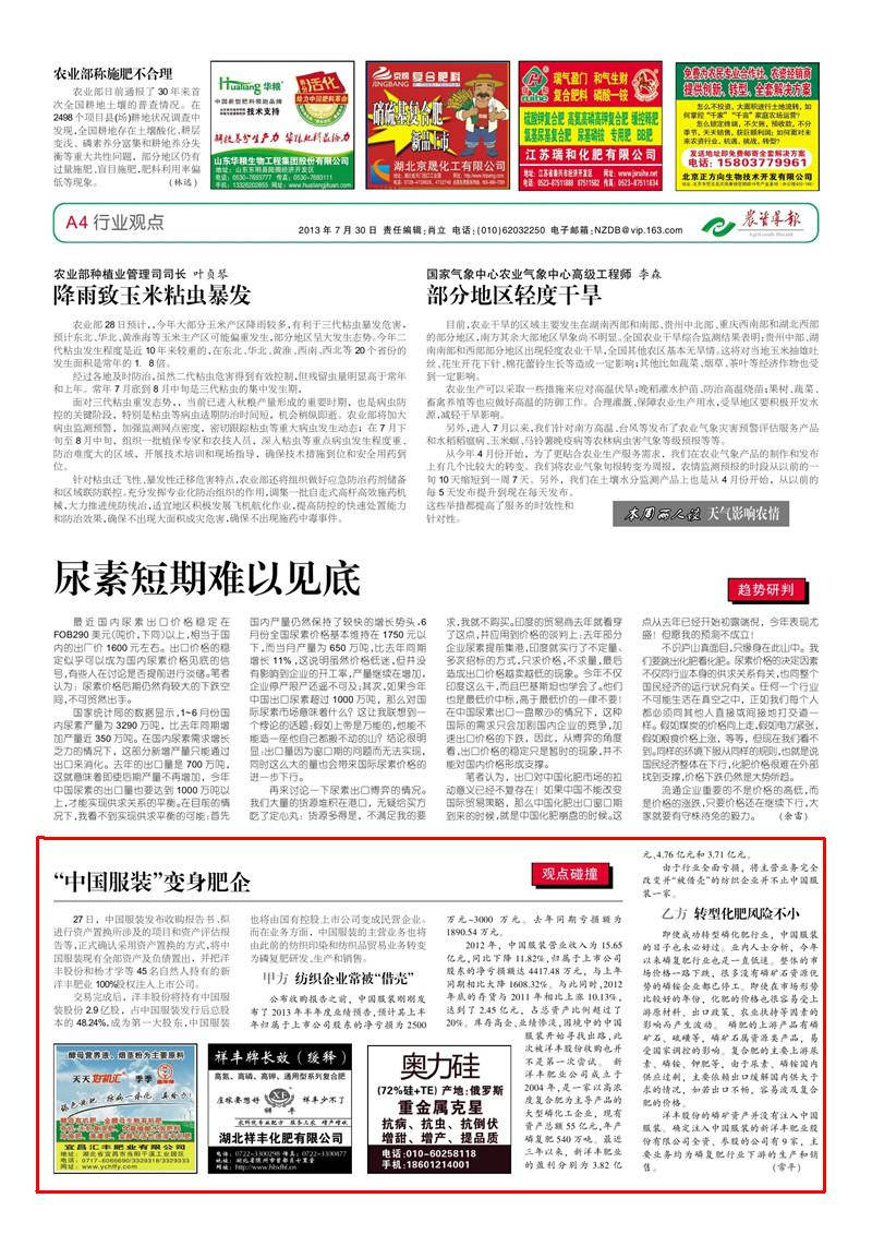 即便成功转型磷化肥行业,中国服装的日子也未必好过。业内人士分析,今年以来磷复肥行业也是一直低迷。整体的市场价格一路下跌,很多没有磷矿石资源优势的磷铵企业都已停工。即使在市场形势比较好的年份,化肥的价格也很容易受上游原材料、出口政策、农业扶持等因素的影响而产生波动。磷肥的上游产品有磷矿石、硫磺等,磷矿石属资源类产品,易受国家调控的影响。复合肥的主要上游尿素、磷铵、钾肥等,由于尿素、磷铵国内供应过剩,主要依赖出口缓解国内供大于求的情况,如若出口不畅,容易波及复合肥的价格。洋丰股份的磷矿资产并没有注入中国服装。确定注入中国服装的金沙9001以诚为本肥业股份有限公司全资、参股的公司有9 家,主要业务均为磷复肥行业下游的生产和销售。(常平)
