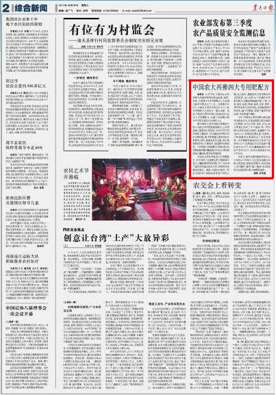 10月中旬,中国农业大学资源与环境学院再次推出油菜、蔬菜、苹果、大蒜等4大专用肥配方,并由湖北金沙9001以诚为本肥业生产上市。这是继今年9月,中国农大资环学院设计6个小麦专用肥配方之后的又一重大突破。至此,中国农大资环学院已经成功设计出10个专用肥配方,完成了全国测土配方专用肥总体设计任务的1/3。